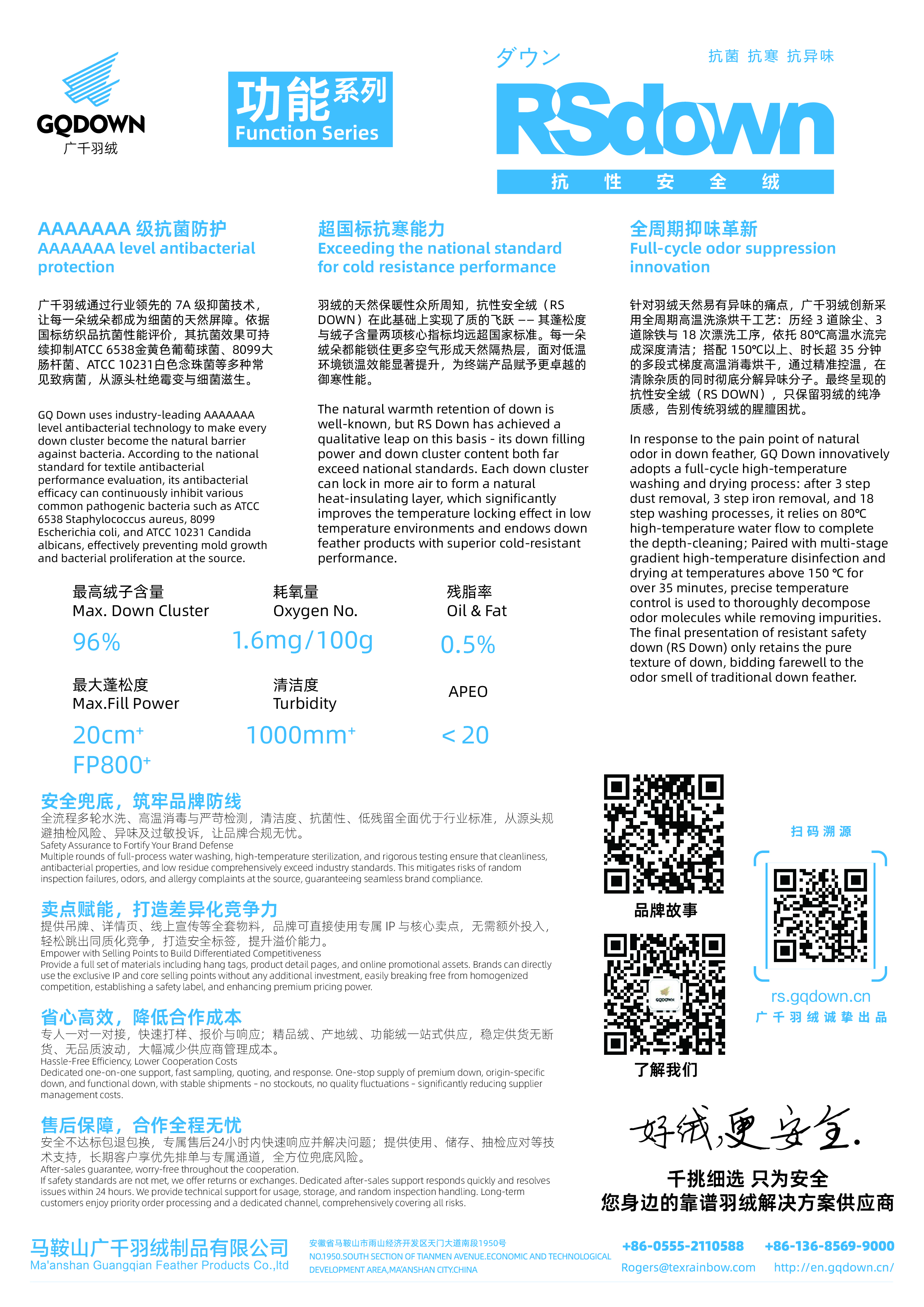 RS DOWN Resistant Safety Down is developed to address three major industry key issues of traditional down: susceptibility to bacterial growth, insufficient warmth retention, and natural odors. Centered on the core concept of "Triple Resistance for Ultimate Safety", it features 7A‑grade efficient antibacterial technology, exceeds national standards for fill power to enhance cold resistance and warmth retention, employs a high‑temperature washing and drying process to eliminate odors at the source, and supports full‑process traceability via QR code scanning. It redefines the safety standard for down, providing brands with safe, warm, comfortable, and high-quality core raw materials.